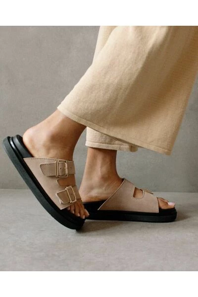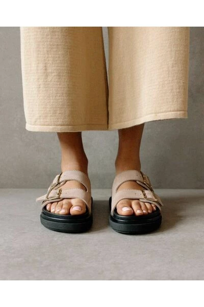 Chunky sandaal met open neus en twee dikke banden aan de voorkant, beide op hun plaats gehouden met een gesp aan de zijkant.