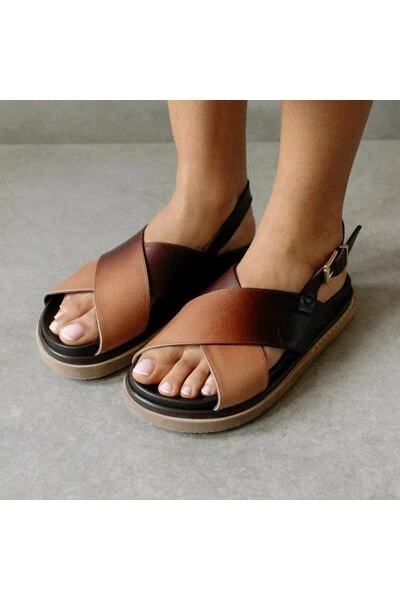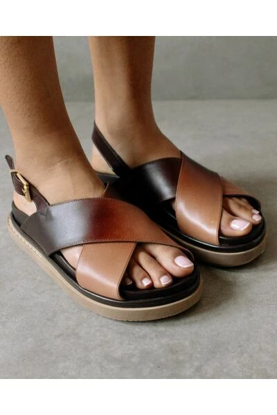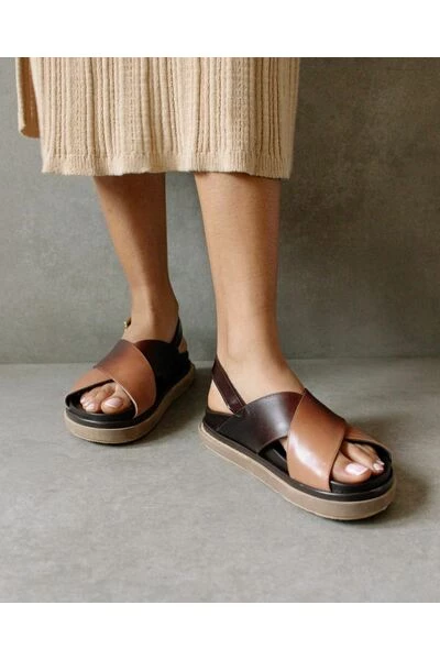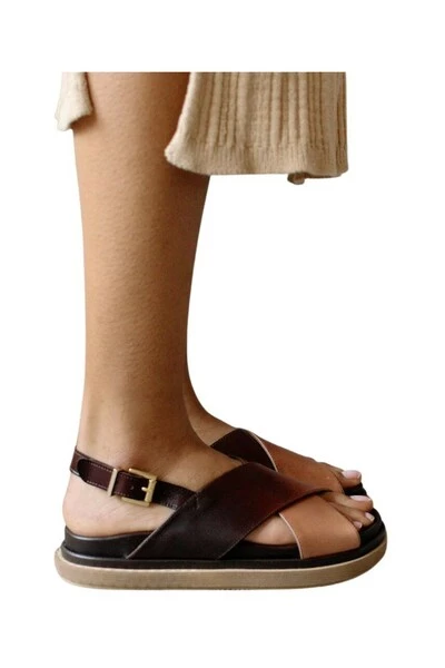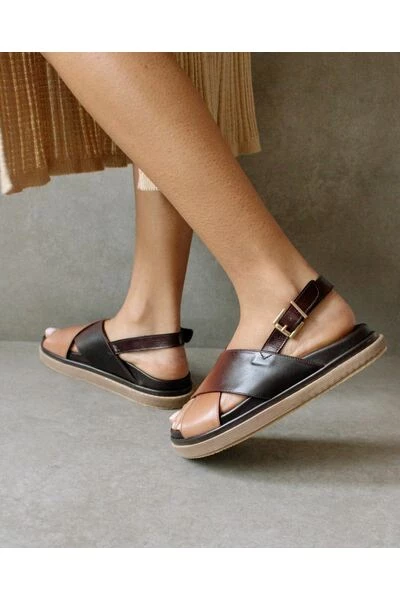 Deze bruine leren sandalen hebben een achterband met gesp en een maxi dubbellaagse zool. Ze hebben ook twee gekruiste zwarte banden en een open teen voor ademend vermogen.