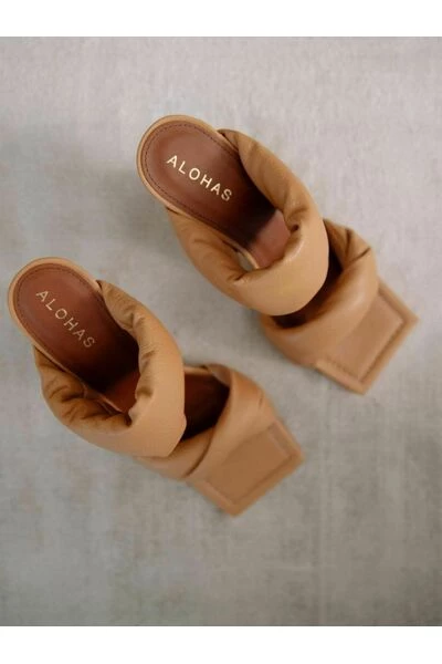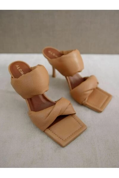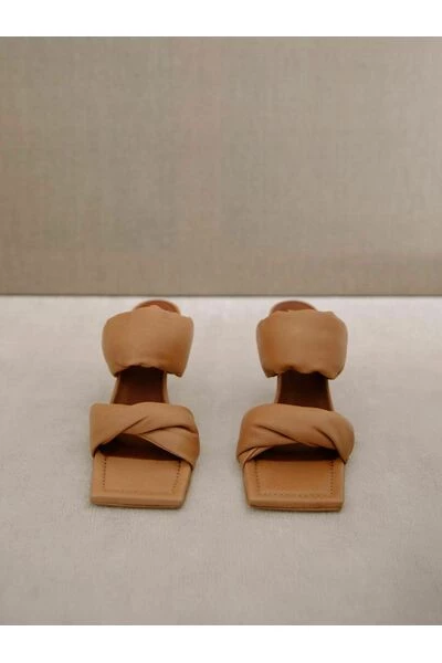 Twee sandalen met riempjes hebben een vierkante neus, een spitse hak en twee zeer dikke gewatteerde banden: één achter de tenen voor maximale grip en comfort, en één tussen de wreef en het enkelgebied.