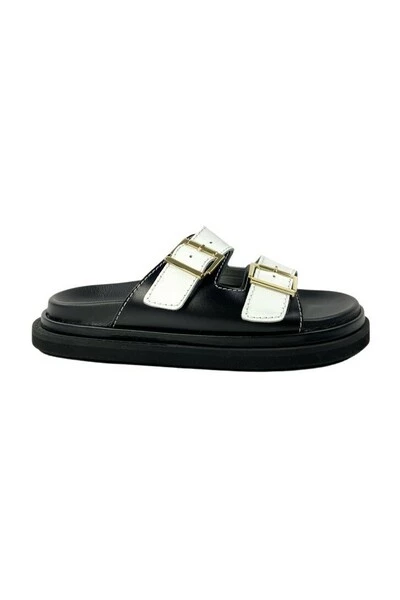 Alohas sandalen. Zwart -witte platte sandalen met dubbele gesp.